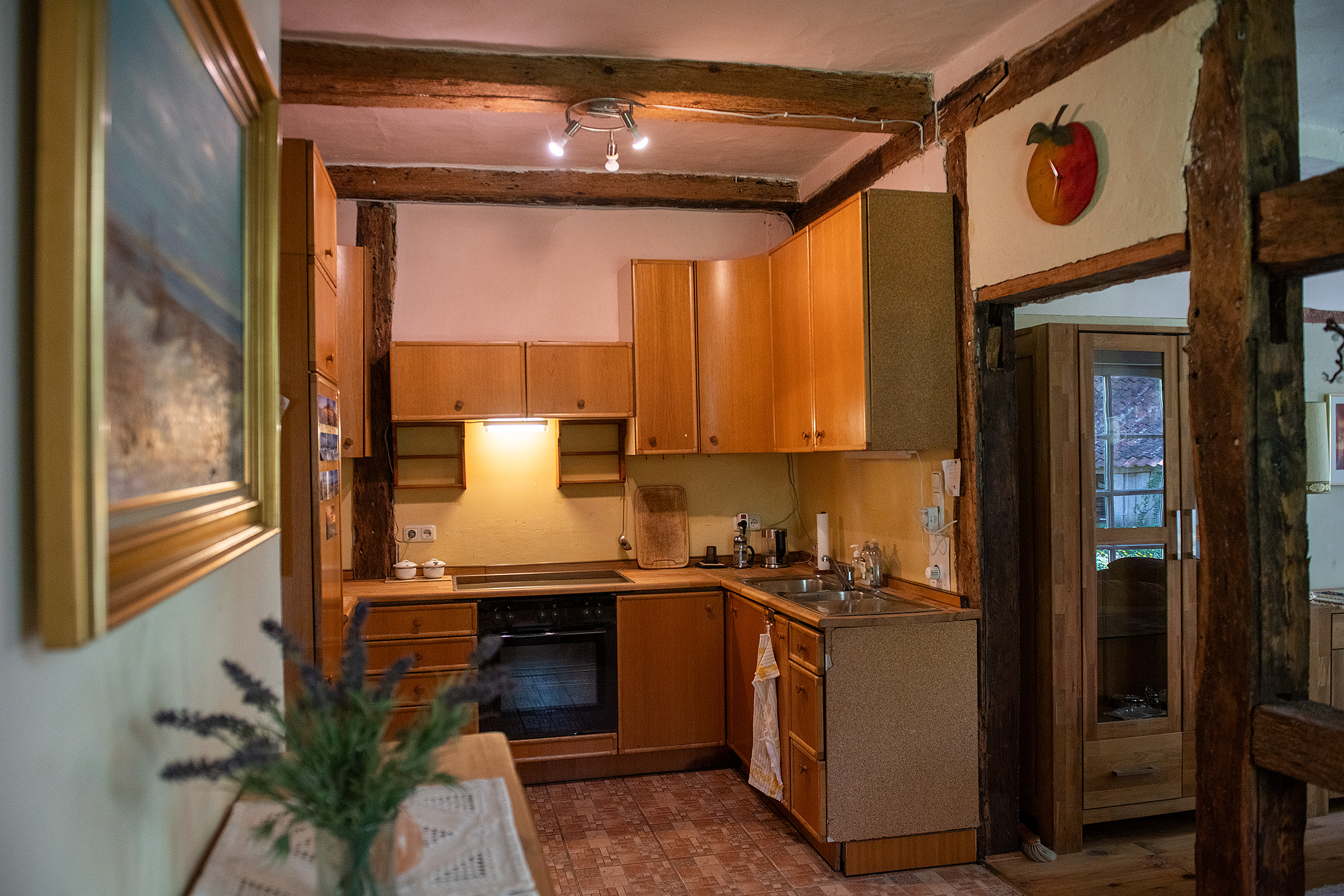 The apartment has about 130 m² (roof slopes proportionally calculated), goes over two floors and has a garden and a shared cellar. Downstairs are entrance, kitchen, bathroom, a dining room (open to the kitchen) and a large living room with a fireplace. Upstairs are one large and two smaller rooms under the roof.